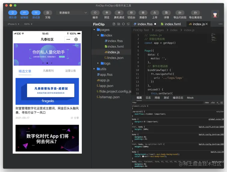 FinClip 还提供小程序 IDE 开发工具,界面与微信小程序的开发工具类似,自带调试和真机预览,简单易上手。你可以在这个 IDE 里面,对现有项目进行二次开发,扩展功能和接口,或者从零开始写出一个小程序,貌似他们最近打算针对这个IDE做一些功能优化,实现小程序直接生成APP功能,感兴趣的朋友可以后续关注一下。