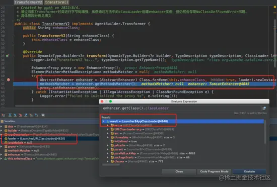 我们可以在transform方法中通过传入的LaunchedURLClassLoader来动态创建TomcatEnhancer实例,于是就有了TransformerV2版本的类增强变换方案,打开其transform()方法,可以看到其如下代码实现,