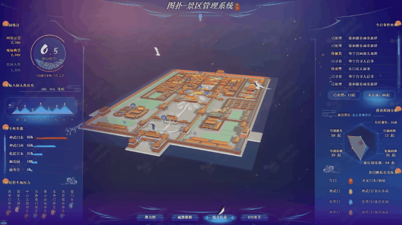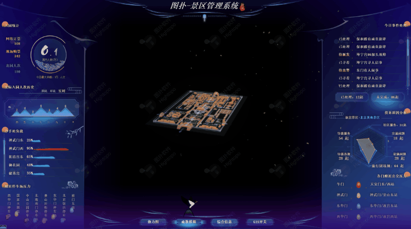 分别统计网络订票、现场购票、出园人次,将智能监控设备和人脸识别的数据接入图扑软件可视化系统,实现主动式安防。运维可时刻关注可视化系统内的游客数据,将园区游客数控制在合理范围,便于疫情防控。