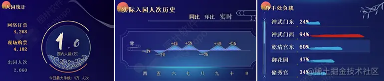 渐变色三角形柱状图实现日均入园人次的同比、环比、实时数据展示。图扑运用图形化的手段清晰有效地将数据信息进行解读和传达,帮助我们发现其中的规律和特征,挖掘数据背后的价值。