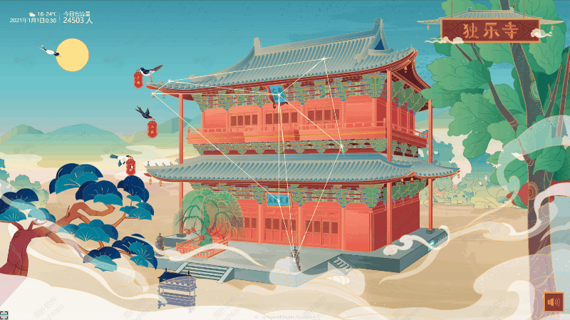 北京故宫内的建筑分为外朝和内廷两部分。外朝的中心为太和殿、中和殿、保和殿。内廷的中心是乾清宫、交泰殿、坤宁宫。以故宫宫殿布局为原型搭建 3D 古风场景,用喜鹊和飞翔的白鹤衬托古典风,体现人与自然的和谐共处。结合科幻配色,用红砖黄瓦的紫禁城,将源远流长的中国历史娓娓道来。接入 VR 设备进行游览,可达到身临其境的效果,带来沉浸式的体验。