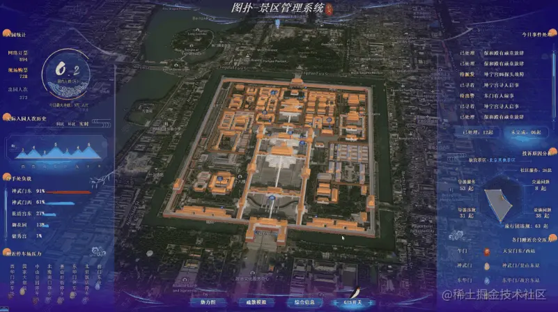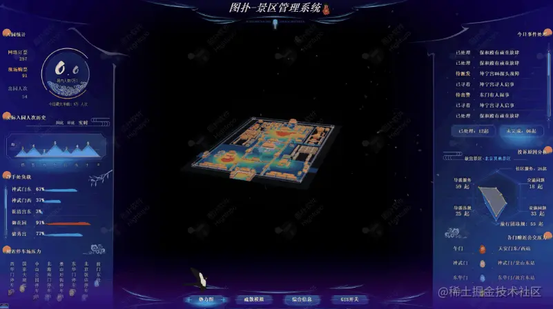 绿色进度条显示神武门东、神武门西、乾清宫东、御花园净手处的负载率百分比,当负载超过 80% 进度条变为黄色,超过 90% 进度条变为红色。通过 HT for web 与 GIS 的结合,运维可运用图扑软件的可视化大屏查看人流拥挤的位置,并通过智能手环等穿戴设备将位置信息传递给安保人员。