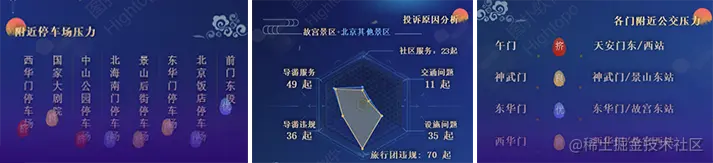 动态雷达图展示导游服务、导游违规、交通问题、设施问题、旅行团违规的次数。图扑软件 HT 可视化利用丰富的图表、图形和设计元素将相对复杂、抽象的数据通过可视的方式以更直观理解的形式展现,便于景区管理。