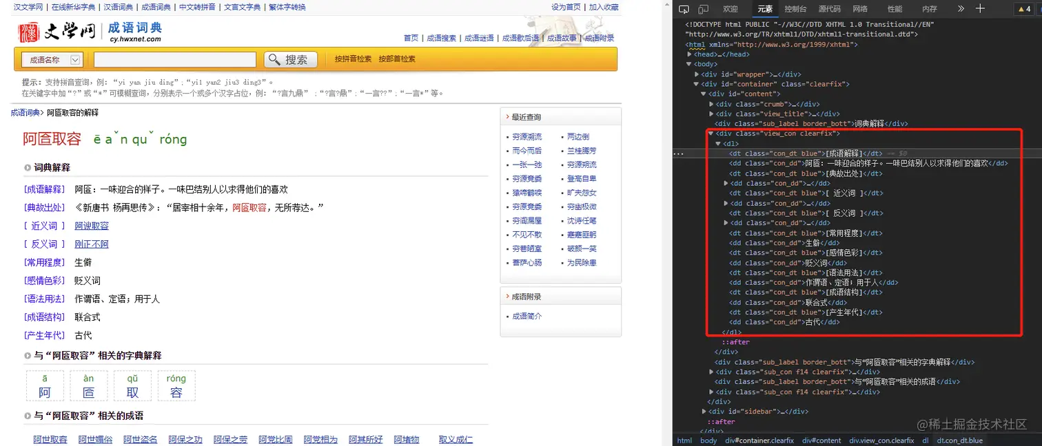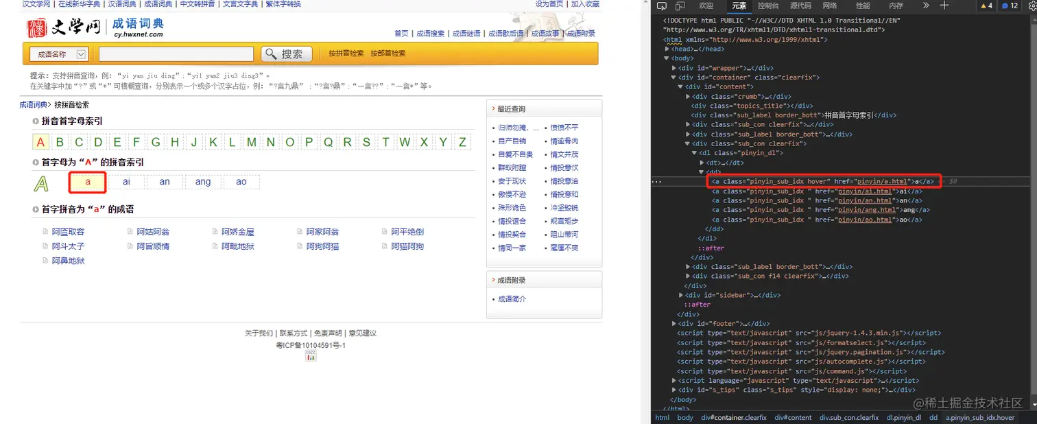我们要先获取每一页的初始信息,在get_all_chengyu3()里面注释的部分就是,在得到之后已经将其存储下来了,接着随便点击一个成语,进入到具体的详情页: