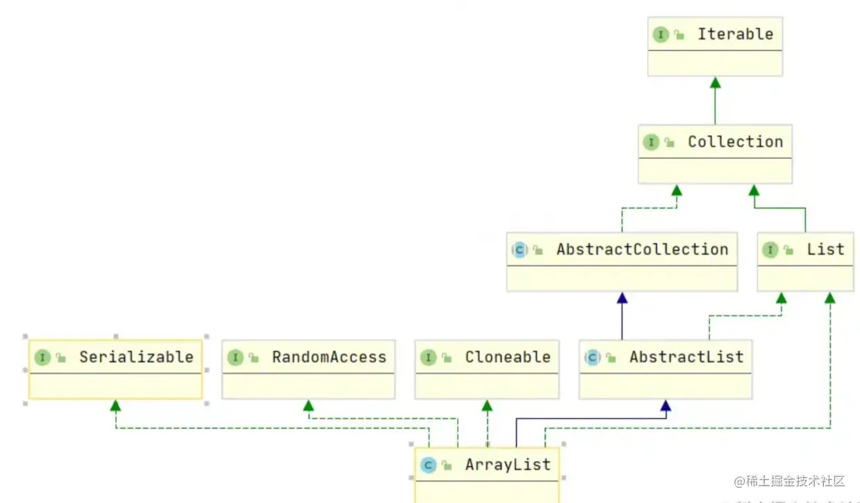 我们先看一看ArrayList的类图。他继承于AbstractList,而这个类是List类的的骨架,可以说这个类是List类的基石