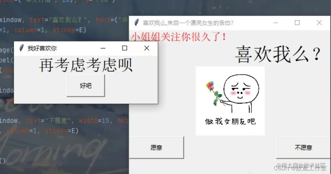 def closeWindow(): messagebox.showinfo(title="警告", message="关不掉吧,气不气") return def noLove(): no_love = Toplevel(window) no_love.geometry("300x100+610+260") no_love.title("我好喜欢你") label = Label(no_love, text="再考虑考虑呗", font=("华文行楷", 25)) label.pack() btn = Button( no_love, text="好吧", width=10, height=2, command=no_love.destroy) btn.pack() no_love.protocol("WM_DELETE_WINDOW", closeNoLove) def closeNoLove(): # messagebox.showinfo("不喜欢我,你就关不掉") messagebox.showinfo(title="警告", message="不喜欢我,你就关不掉") noLove() [if !supportLists]· [endif]1 点击喜欢然后关闭窗体的事件 def closelove(): messagebox.showinfo(title="好怂啊你", message="喜欢我直说就行") return 喜欢的事件 def love(): love = Toplevel(window) love.geometry("300x150+610+260") love.title("好巧啊,我也喜欢你") label = Label(love, text="如家酒店A350等你", font=("华文行楷", 20)) label.pack() label = Label(love, text="电话给我,美滋滋", font=("华文行楷", 25)) label.pack() entry = Entry(love, font=("楷体", 15)) entry.pack() btn = Button(love, text="嗯嗯", width=10, height=2, command=closeallwindow) btn.pack() love.protocol("WM_DELETE_WINDOW", clo selove