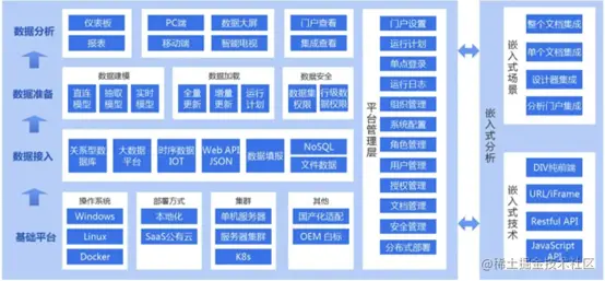 所谓嵌入式 BI,就是在企业现有业务系统中按需集成各种类型的数据分析能力。这种集成工作一般需要考虑两个要点:一方面,它本质上是现有业务系统的一次升级过程,需要关注升级内容与原系统的兼容性、稳定性、安全性等指标;另一方面,业务侧一般希望深度集成专业的数据分析组件,而不是任意挂载一个简单的模块应付了事。这两个要点为开发团队提出了更高的要求和挑战,需要团队认真对待。
