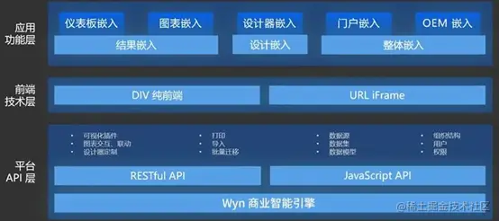 如上所示,对于业务人员来说,应用功能层的数据分析仪表板、图表、设计器、门户等模块,就是嵌入式 BI 方案展现出来的最终效果。其中,模块的内容和形态一般是根据业务需求决定的,例如为某个销售看板集成一些销售数据动态图表,实时反映各地区的当前销售状况。由于业务需求往往比较多样化,嵌入模块的内容和形态也非常多变,这就要求前端技术层具备更强的适应能力。 前端技术层在过去普遍采用 URL iFrame 架构来实现模块嵌入,如今更复杂的需求更多用 DIV 方式打造解决方案。 API 层对于嵌入式 BI 方案是非常重要的。例如,API 允许根据用户类型打开和关闭工具栏,只允许根据使用规则显示指定的数据源,并支持创建具有不同过滤器和选项的仪表板。专业的嵌入式BI可以通过调用 API,在应用软件内对仪表板/报表进行权限管理、分类管理、重命名、删除等深度集成操作,而应用软件和 BI 软件之间的接口对最终用户是完全透明的。当然,对于较为简单的业务需求而言,嵌入式 BI 架构中取消 API 层,或者只有简单的 API 层也是可以接受的。 主流实现方案对比 如上所述,对于开发团队而言,嵌入式 BI 方案的技术选型关键在于 DIV 和IFrame 架构的选择,以及是否加入强大的 API 层。 IFrame 架构在早期的嵌入式 BI 市场非常流行,因其原理简单、实现方便、开发周期较短,使企业能够快速实现初期的嵌入式 BI 需求。但这种方式虽然简单,局限性也是很大的。例如,使用 IFrame 就很难在系统中深度集成数据分析模块。IFrame 更像曾经的 Flash 元素,是一种相对独立的模块。它与页面的其他元素很难融合和互动,即便可以实现也需要付出大量努力和代价。 如上所示,对于业务人员来说,应用功能层的数据分析仪表板、图表、设计器、门户等模块,就是嵌入式 BI 方案展现出来的最终效果。其中,模块的内容和形态一般是根据业务需求决定的,例如为某个销售看板集成一些销售数据动态图表,实时反映各地区的当前销售状况。由于业务需求往往比较多样化,嵌入模块的内容和形态也非常多变,这就要求前端技术层具备更强的适应能力。 前端技术层在过去普遍采用 URL iFrame 架构来实现模块嵌入,如今更复杂的需求更多用 DIV 方式打造解决方案。此外,以 Wyn 商业智能为例,其 BI 模块还可以同泛微、用友 U8+、企业微信和钉钉等常用的企业信息系统集成,增强它们的数据分析能力。 API 层对于嵌入式 BI 方案是非常重要的。例如,API 允许根据用户类型打开和关闭工具栏,只允许根据使用规则显示指定的数据源,并支持创建具有不同过滤器和选项的仪表板。专业的嵌入式BI可以通过调用 API,在应用软件内对仪表板/报表进行权限管理、分类管理、重命名、删除等深度集成操作,而应用软件和 BI 软件之间的接口对最终用户是完全透明的。当然,对于较为简单的业务需求而言,嵌入式 BI 架构中取消 API 层,或者只有简单的 API 层也是可以接受的。