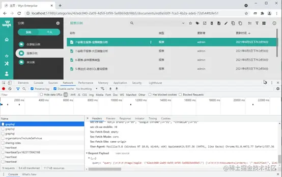 GraphQL API 不需要为不同的对象操作提供不同的 URL。不同对象的不同操作均通过一个统一的URL调用,只是各类操作提交的数据不同。可以看到,GraphQL API 的操作非常易于上手,可以大大方便开发团队和业务团队,满足各类复杂的业务需求。下面来看 Wyn 商业智能提供的一个数据查询 API 的操作示例,从中可以体会 API 的低门槛与便利性: