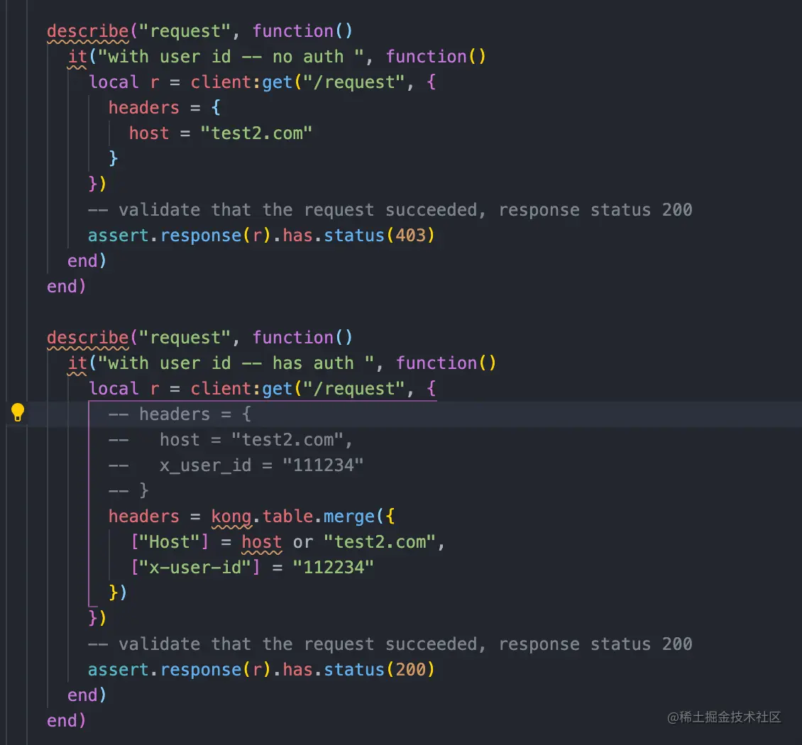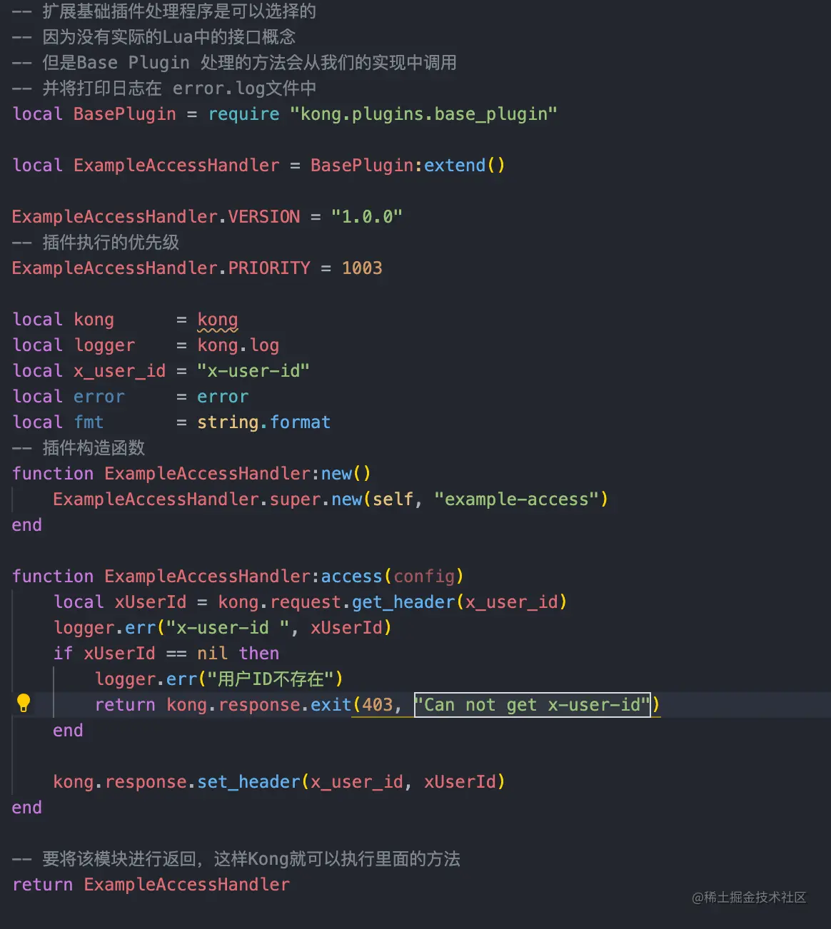 那么在简单了解了那些主要文件以及他们的作用之后,我们就可以开始自己的编码了,我这边写了一个比较简单的插件,主要的功能就是检查请求头中是否带有x-user-id这个key,如果没有就返回403,如果有那么就将这个k-v写入返回的头信息中,下面贴一下 handler.lua 的代码