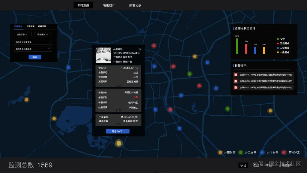 支持对水/电/气/热、井盖、消防、通讯、电力、照明等基础设施的数量、地理分布、运行状态进行实时监控,支持部件详细信息查询、异常态势预警告警,辅助城市管理者准确、高效监测城市公用设施运行状态。