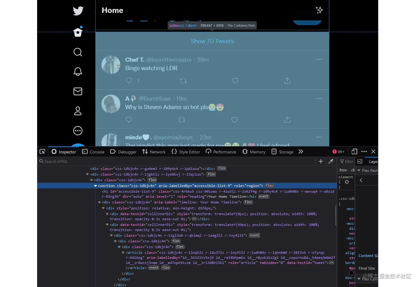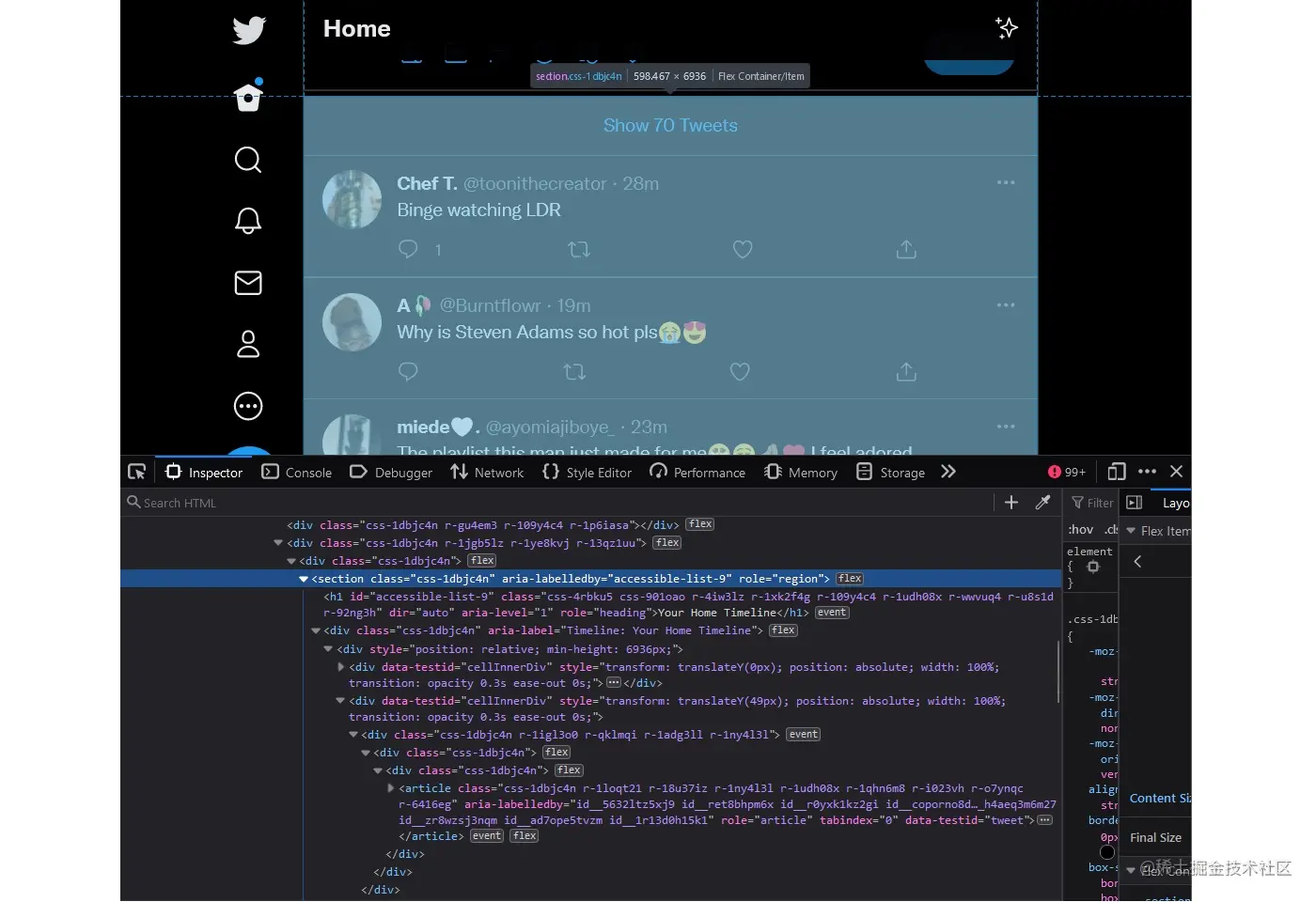 让我们再看一下Twitter,这是一个使用aria-labelledby 技术的网络应用。看一下开发者工具,特别是持有你的时间线的section 。你会看到section's opening tag中的一个aria-labelledby="accessible-list-9" 属性。它指向就在它下面的h1 元素,该元素有一个id="accessible-list-9" 和文字内容,写着 "你的主页时间线"。现在屏幕阅读器的用户可以使用屏幕阅读器中的地标导航菜单,并导航到 "你的主时间线区域"。