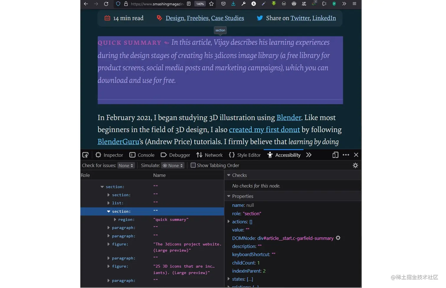Smashing杂志在这篇博文的 "快速总结 "部分使用了aria-label 技术。如果你打开你的开发者工具并检查 "快速摘要",这就是标记的样子。