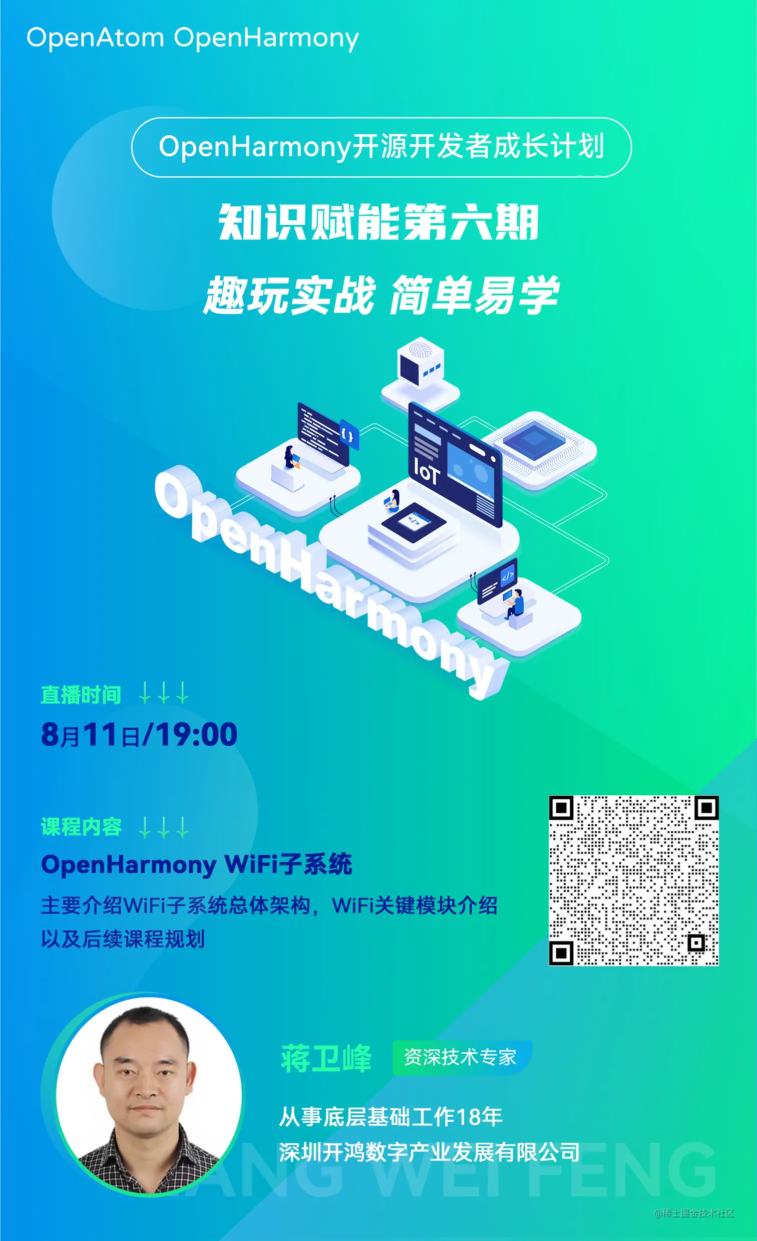 而第5节直播将由从事底层基础工作18年的资深技术专家蒋卫峰老师讲解《OpenHarmony WiFi子系统》,将主要介绍WiFi子系统总体架构,WiFi关键模块介绍以及后续课程规划,依旧干货满满!