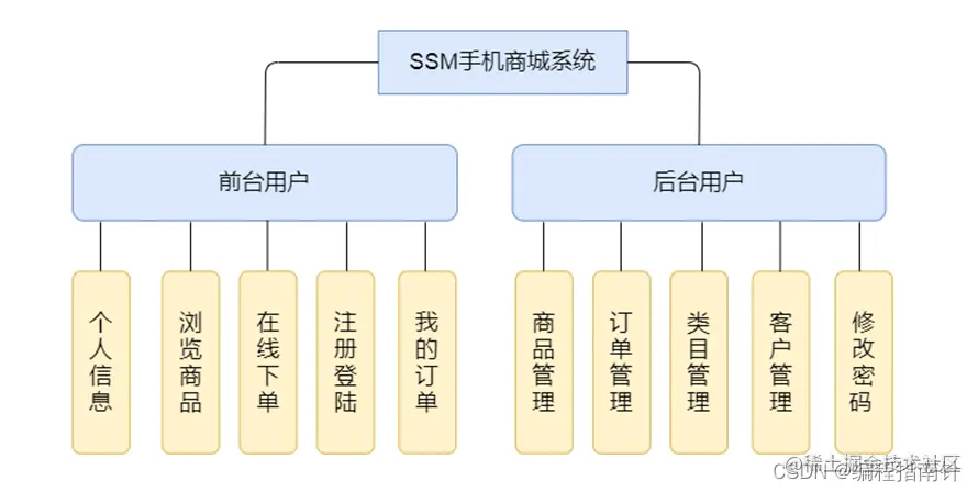 SSM手机商城系统的使用者主要包含两种用户角色,其一是商城后台管理员角色,其二是商城前端用户角色,这两个角色的具体功能如下: