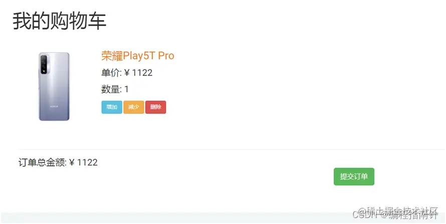 SSM手机商场面前台用户登陆系统后可以进入手机详情页面中将手机添加到购物车。然后在购物车中可以实现在线下单购买操作。添加购物车及用户下单操作界面如下图3-2、3-3所示。