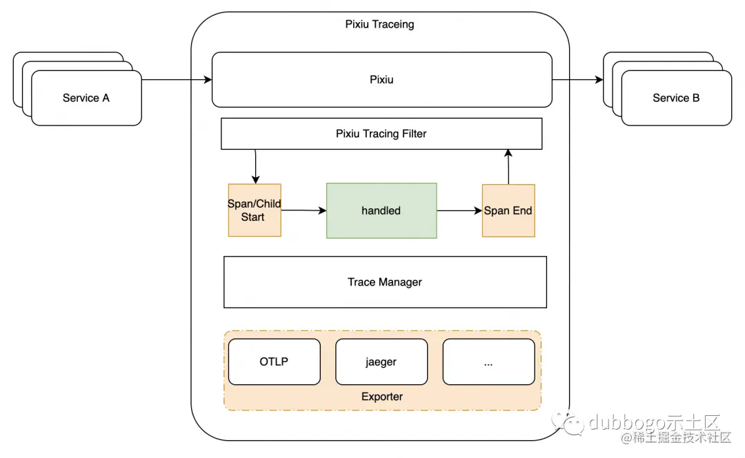 Features 1 可观测性之分布式链路追踪 我们常说的可观测性大致分为三个方向:Logging、Tracing 和 Metrics。皆在帮助开发者快速分析和诊断分布式应用的性能瓶颈,提高开发诊断效率,而在 0.5.1 版本,Pixiu 也投入了相当一部分精力在 Tracing 方向,下面简单介绍一下由社区 Maxingg 同学为 Pixiu 提供了HTTP场景 Tracing 能力。