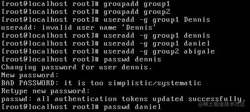 【题1.1】建立两个用户组group1和group2,以及三个用户dennis、daniel、abigale,并且将前2个用户分配在group1用户组下,后一个分配在group2用户组下