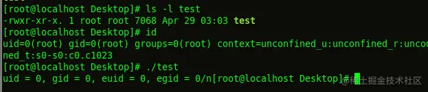 通过 id 命令看到当前登录用户为 root,uid=0,gid=0。通过 ls 命令可以看出 test 程序没有设置SUID 和 SGID,所有者是 root,所有组也是 root。