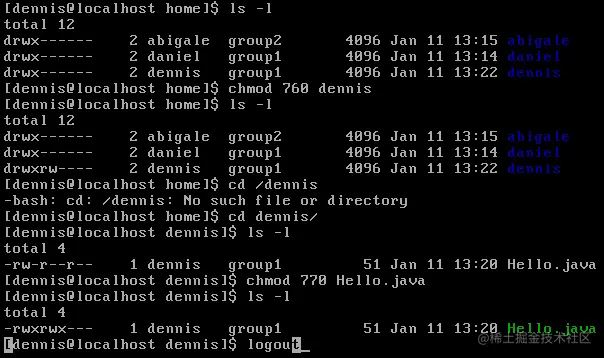 【题1.4】以dennis用户登录,修改目录/home/dennis及Hello.java文件的读写权限(更正:修改目录权限的时候,应该使用770,而不是760,否则权限不足)