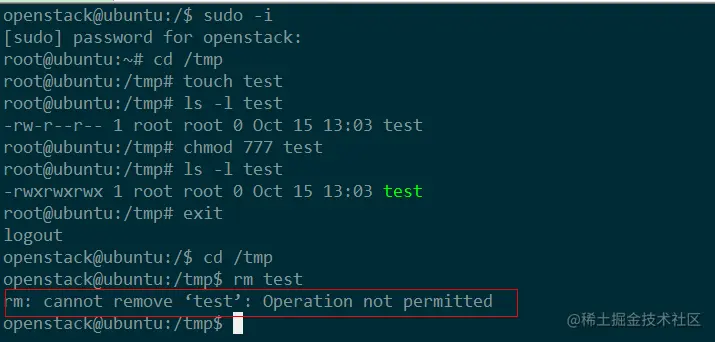 现在我们来验证下,先用 root 账号在 tmp 文件中创建一个文件 test,然后用 openstack (其他账号) 进入该目录,删除 test 文件,看看发生什么情况