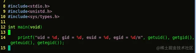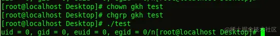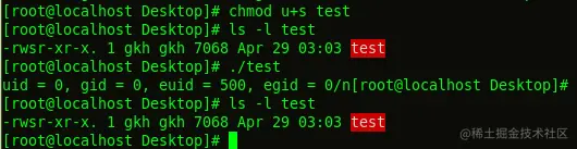 发现结果和上面一样,test 进程的有效用户ID等于实际用户ID(0),有效用户组ID等于实际用户组ID(0)。下面给 test 程序设置 SUID