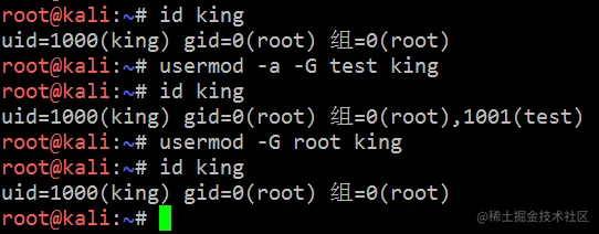 - 实际用户ID( 实际组ID ):标识当前用户(所属组)是谁,当用户登陆时取自口令文件。即标识我是谁。也就是登录用户的 uid 和 gid。比如我的Linux以king用户登录,在Linux运行的所有的命令的实际用户ID都是king的uid,实际用户组ID都是king的gid(可以用id命令查看)