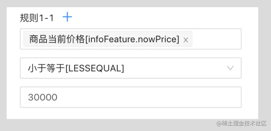 下图是实际的一个规则配置(商品的当前价格是否小于等于30000):