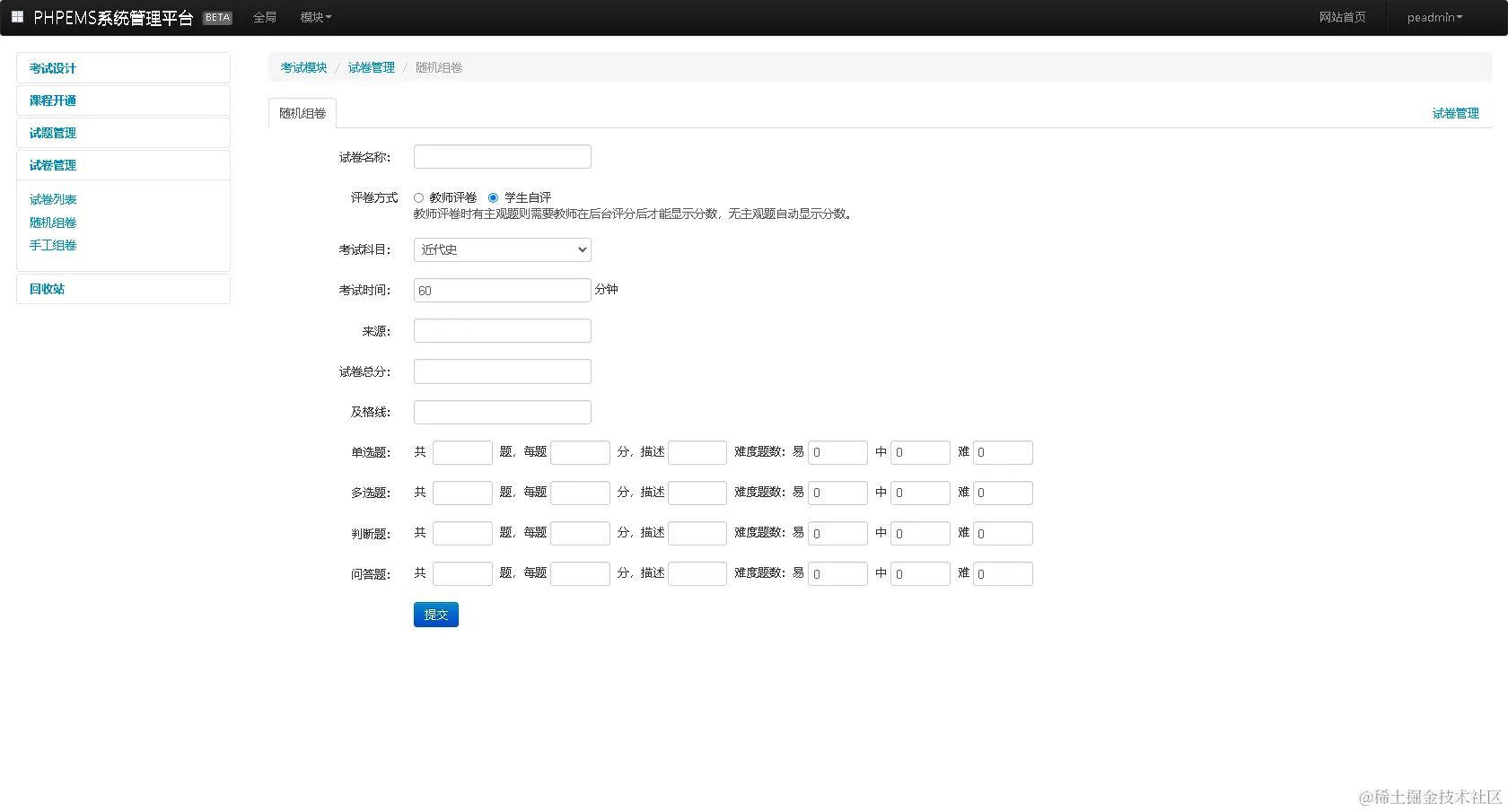 - 支持主客观题型并存,主观题评分可以设置为学生自评和教师后台评分
