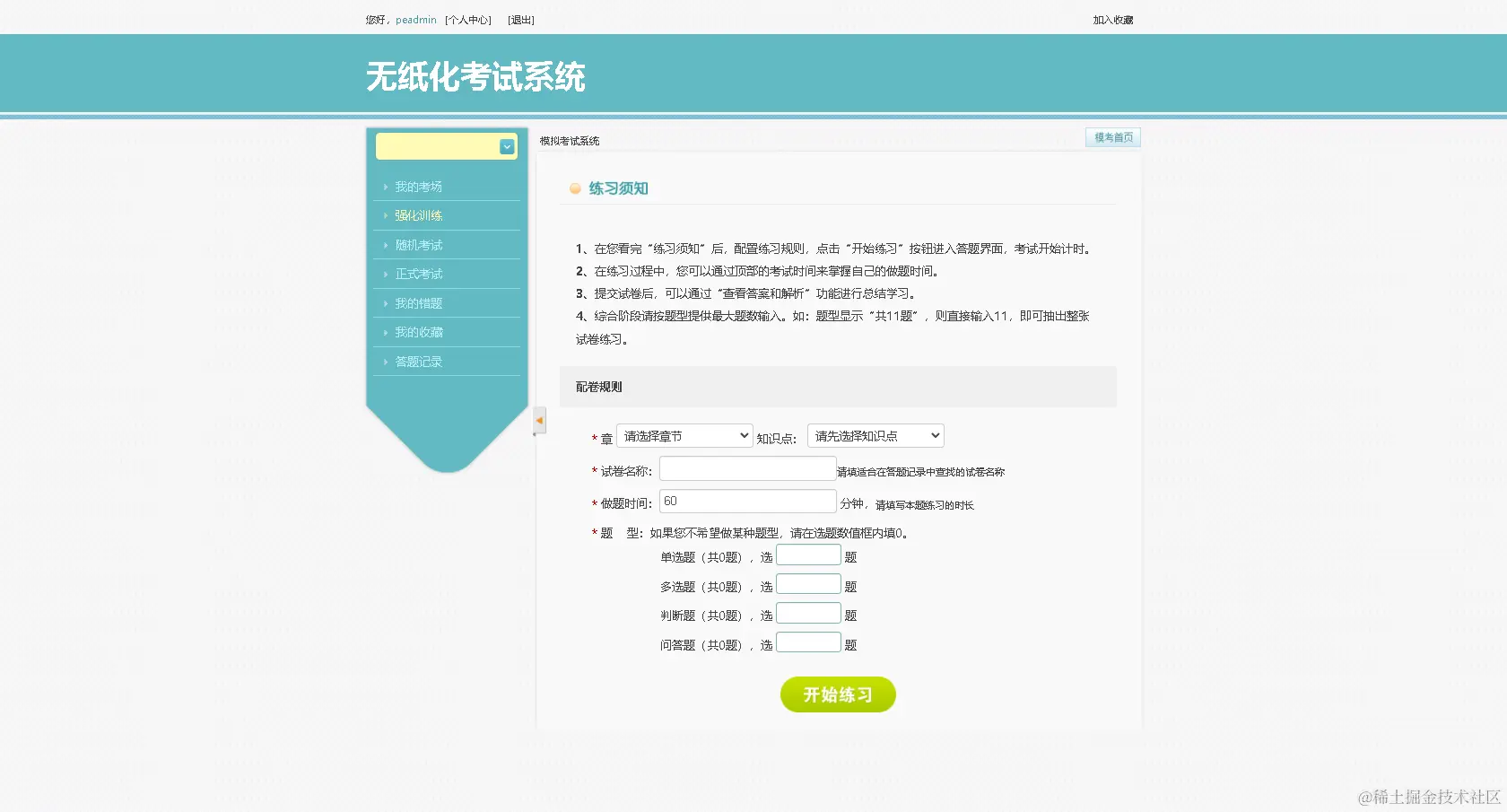 - 支持考场功能,可以对单个用户开通单独考场 ;支持题目收藏、错题重做、考试记录等功能