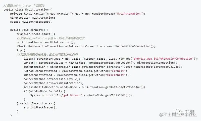 UiAutomationShellWrapper 类的connect方法初始化了UiAutomation对象,UiAutomation提供测试所需功能API。
