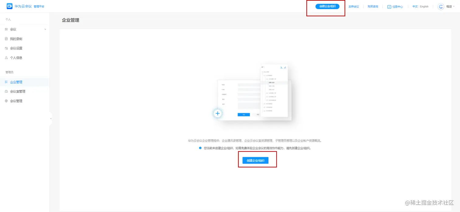 - 在页面右上角单击“创建企业/组织”。