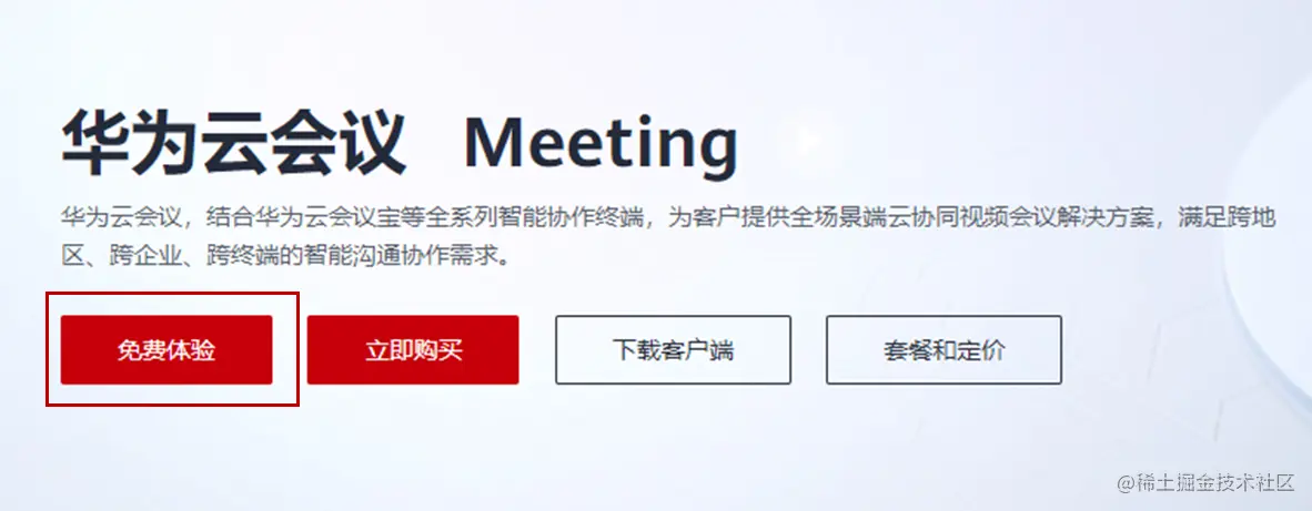 - 在华为云会议产品首页单击“免费体验”,进入注册页面。