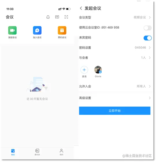 点击“发起会议”即可马上召开会议。