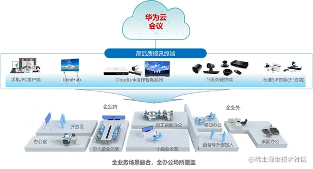 支持华为云会议软硬件终端、第三方硬件终端多种会议终端接入,满足各类会议场景。