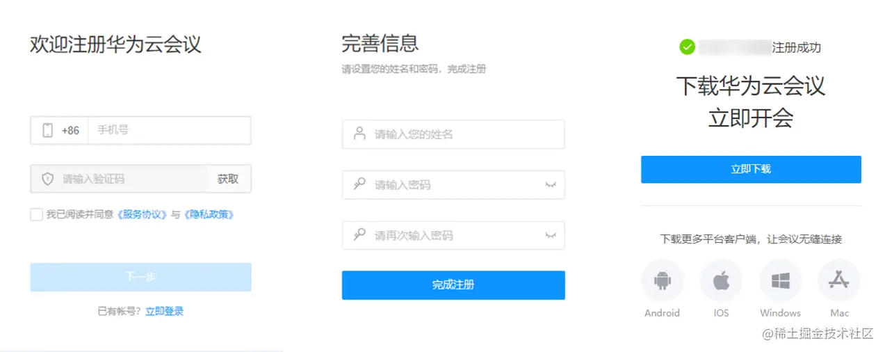 通过Web端、桌面客户端或移动客户端三种方式注册免费版个人帐号。注册成功后,可立即创建会议。