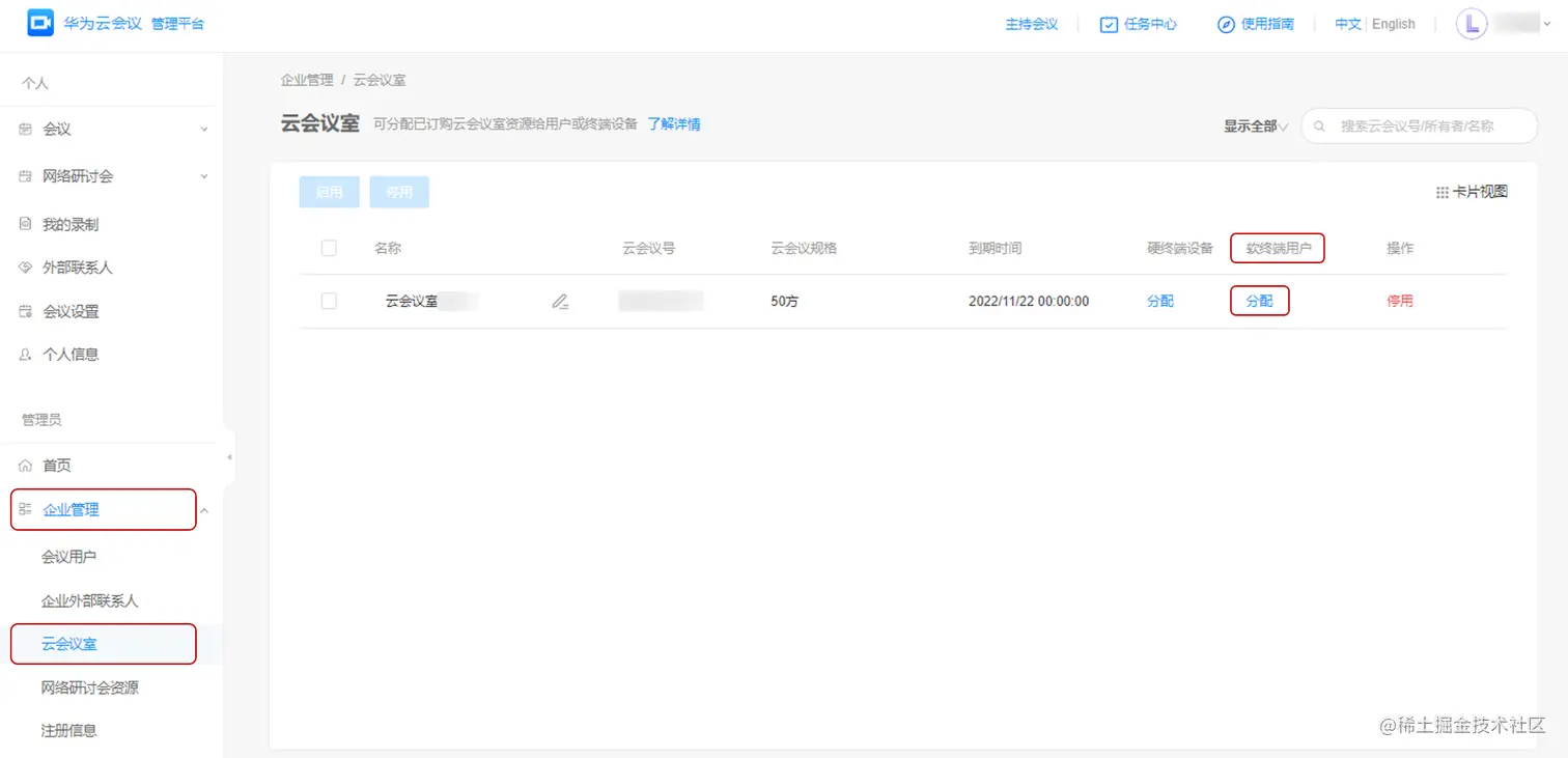- 进入“企业管理 > 云会议室”页面,点击云会议室右侧“软终端用户”列中的“分配”按钮。