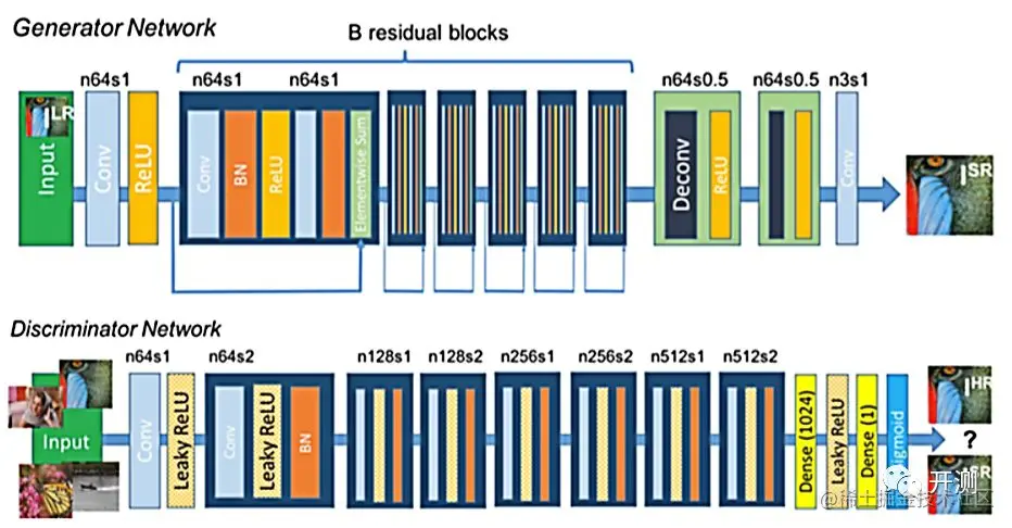 在生成网络部分(SRResNet)部分包含多个残差块,每个残差块中包含两个3×3的卷积层,卷积层后接批规范化层(batch normalization, BN)和PReLU作为激活函数,两个2×亚像素卷积层(sub-pixel convolution layers)被用来增大特征尺寸。