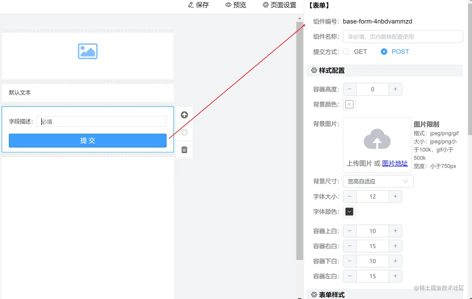 对画布中的组件添加点击事件,当点击某个组件时,我们能够获取到当前点击组件的组件类型,例如输入框、下拉选择等等,针对每一种组件,我们已经提前在元数据中的props属性定义了这个组件能够进行动态控制的参数,我们只需要将这些参数以合适的表单形式展示在右侧的属性配置区域就可以了,例如,按钮组件的props中有一个text属性,用来控制按钮的显示文案,那么我们就在右侧属性控制区域用一个输入框来做为控制这个属性的表单形式,当修改数据时,我们找到list2中该组件所在的元数据对象,然后将该对象中props属性中text属性值修改为输入框中的内容。每个组件都会接受这个组件对应的元数据props参数,然后根据参数值进行渲染。例如按钮组件,现在按钮的文案时,我们可以使用props.text进行显示。