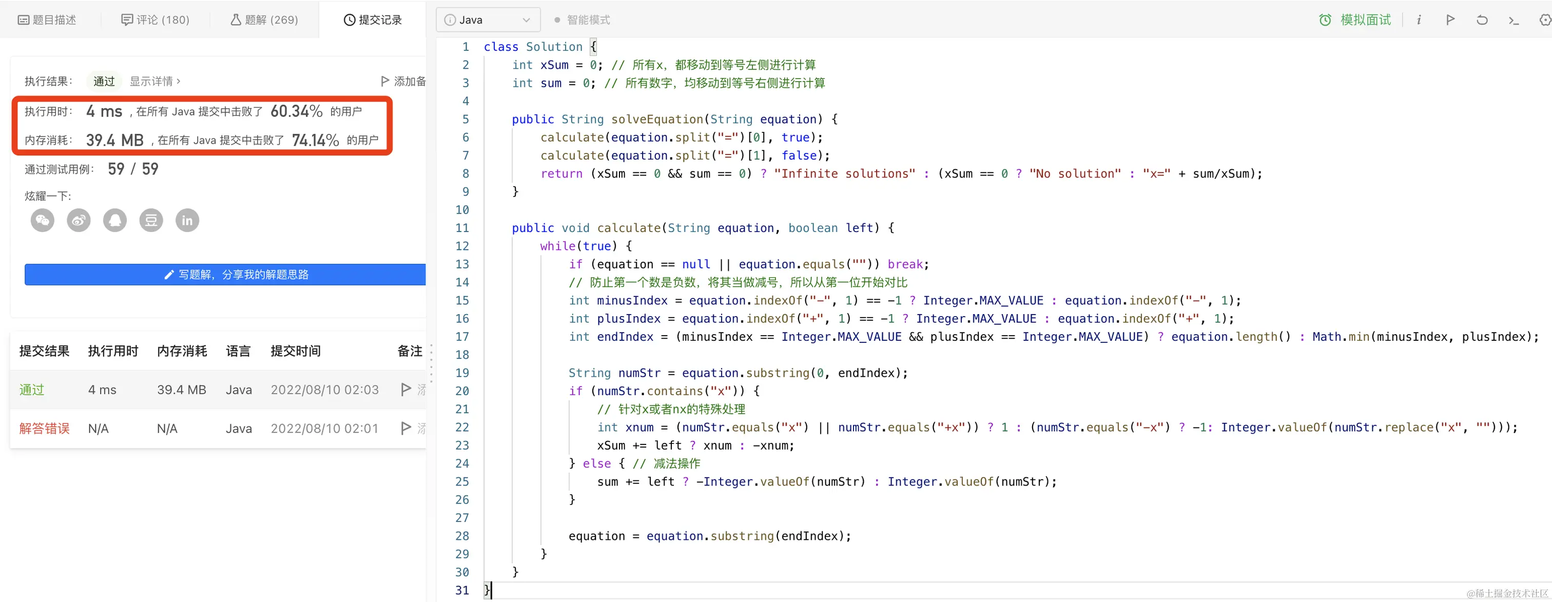 3<= equation.length <=1000equation只有一个 '='.equation方程由整数组成,其绝对值在[0, 100]范围内,不含前导零和变量 'x' 。