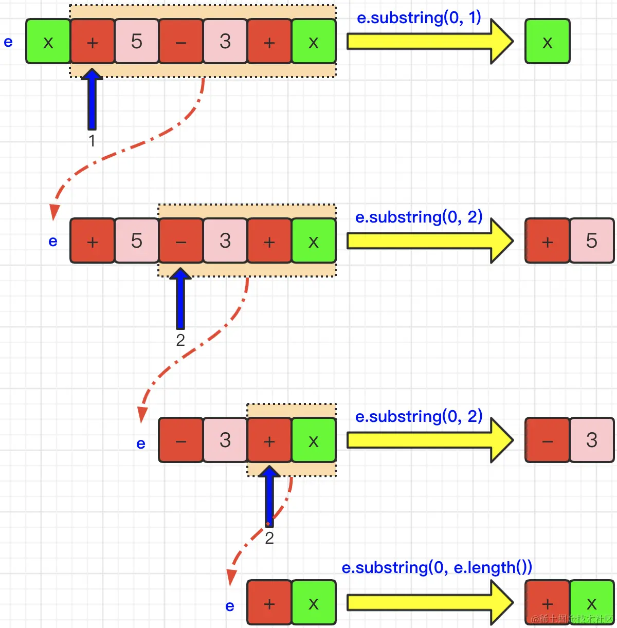 通过等号拆分出“左侧方程字符串”和“右侧方程字符串”之后,我们就需要解析方程字符串了。字符串一般是由三种类型组成:首先,“加号”或“减号”;其次,x变量;最后,非x的整数型数字。那么,我们再解析的时候,就可以通过“加号”或者“减号”来分割运算符和非运算符。这里可以通过substring(...)和indexOf(...)方法来获取子串。以字符串x+5-3+x为例,判断indexOf("-")或indexOf("+")的下标位置,取index下标值最小的作为分割末尾,此时待分割末尾index=1,所以通过e.substring(0, 1)获得截取字符串“x”。最后,我们的e就是截取后剩余的字符串。按照上面的逻辑继续的去拆分,最终会将“x+5-3+x”拆分为:“x”,“+5”,“-3”,“+x”。具体操作如下所示: