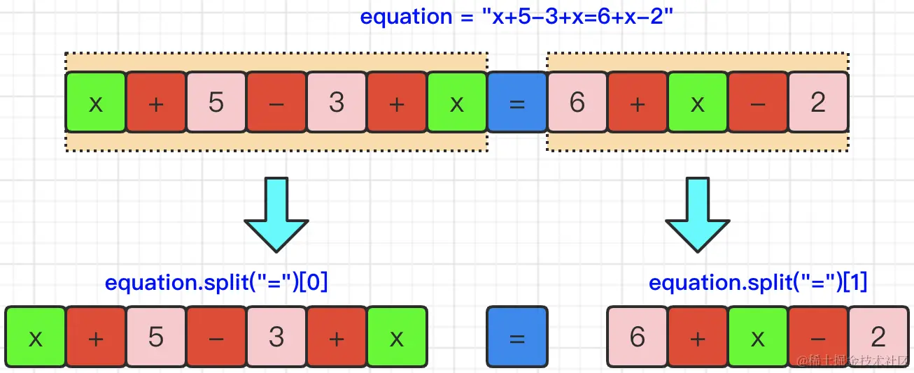 根据题目描述,equation只有一个“=”,所以我们首先可以将整个方程的字符串通过split("=")将其拆分为两部分:左侧方程字符串&右侧方程字符串。为什么要通过等号去拆分整个方程呢?其实有两个主要的原因,首先:我们要针对方程字符串进行解析操作,那么我们可以提供一个通用的拆分方程字符串的方法,这样左侧和右侧的方程字符串都可以通过调用该方法进行拆分操作了。下面我们以equation="x+5-3+x=6+x-2"为例: