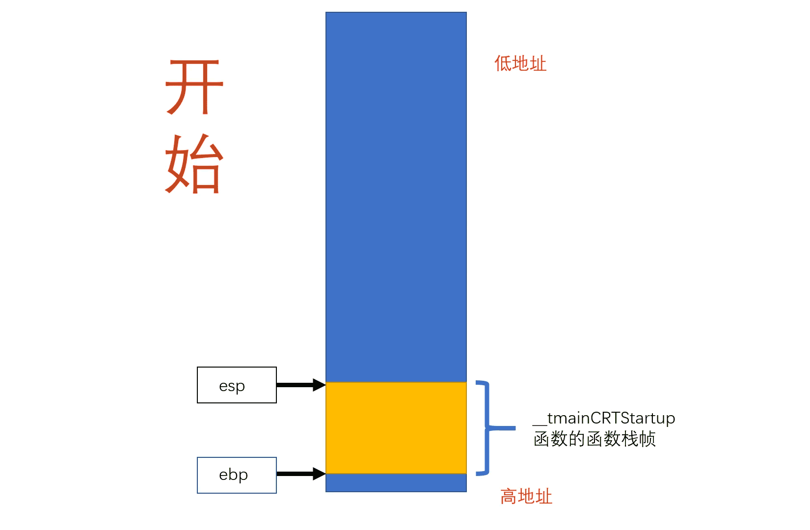 将 ebp 的值放到 __tmainCRTStartup() 函数的函数栈帧的上面 (ebp 的值为该函数栈帧的栈底指针)