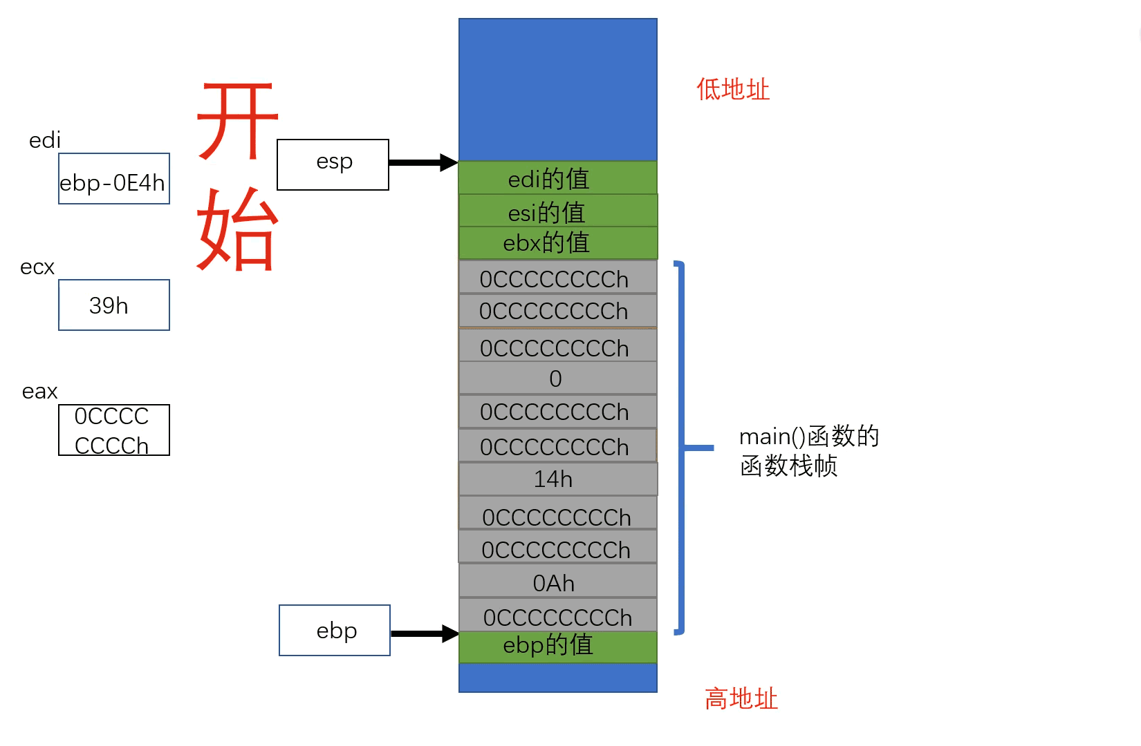 rep stos dword ptr es:[edi]: 从edi ( 此时 edi 中存放的是main函数栈帧栈顶处的值 ) 开始向下将39h这么大的空间中的值全部初始化为 0CCCCCCCCh(eax)。