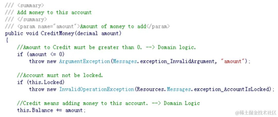 这段源代码是用非核心域C#的概念来实现和Account、Credit、Balance等核心域概念相关的逻辑。