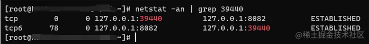 会得到客户端的端口号,我们将在其没有没有close连接的时候,我们使用netstat -an | grep 39440可以查询TCP连接信息。