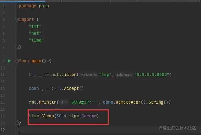 fmt.Println("来访者IP:" , conn.RemoteAddr().String())