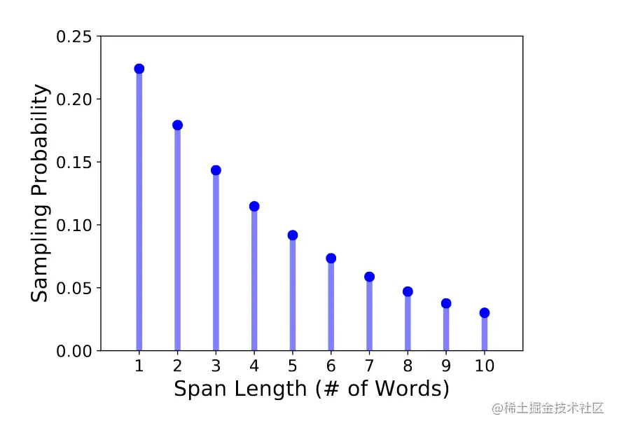 而SpanBERT给出了更加通用的掩码方案,基于几何分布,每次随机生成MASK的长度,再按均匀分布随机生成掩码的位置,位置必须为完整token而非subwords。对于几何分布参数的选取作者选择了,并且限制了长度最长为10,这样平均掩码长度是3.8。