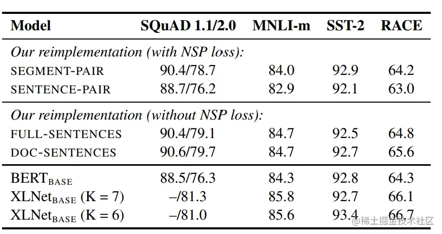 - 移除NSP任务,并没有影响在NLI以及QA任务上的表现