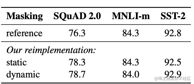 BERT本身的MASK策略是放在数据预处理阶段的,为了保证样本MASK在不同epoch的随机性。BERT是随机生成了10份不同MASK的样本,总共训练40个epoch,所以每份MASK样本会被用到4次。而RoBERTa把MASK放到了input pipe过程中,因此不需要预先生成多份样本,考虑以上RoBERTa使用更多的数据,训练更多的epoch。这个改良更多是面向工程实现上的内存优化,在效果上带来的收益并如下,并不非常显著~